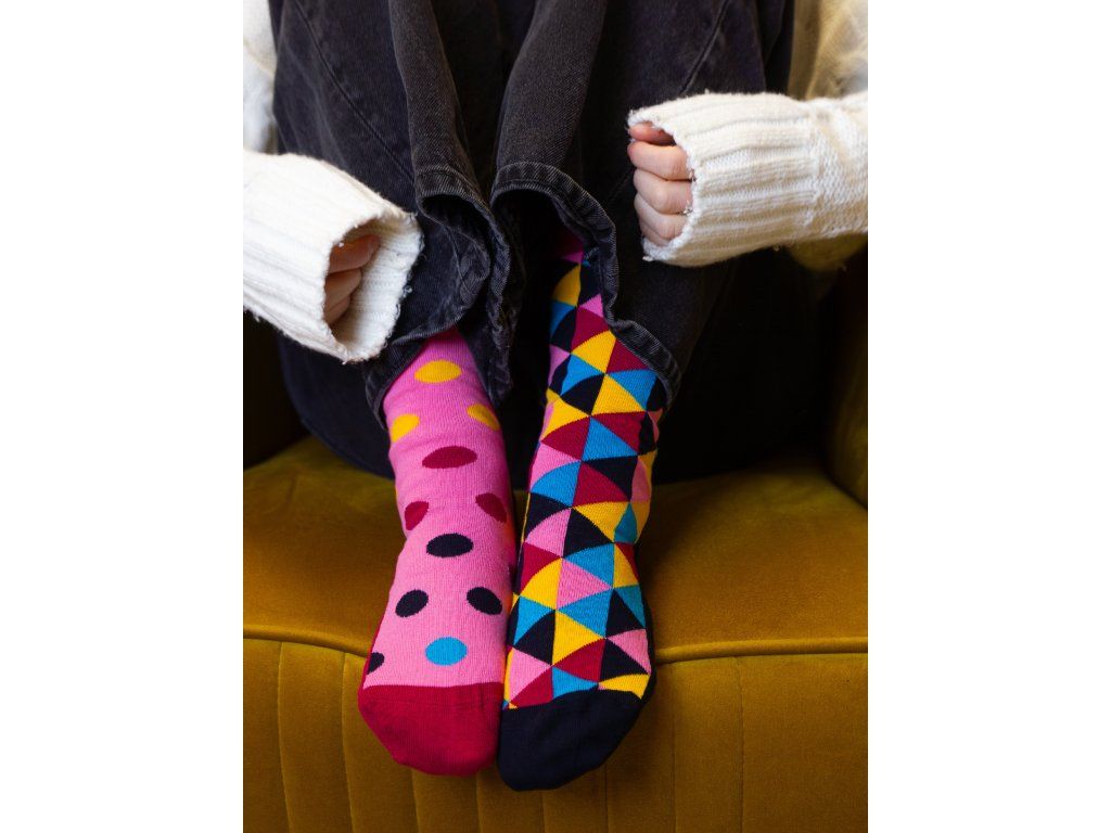 Jeden pár dámských nepárových charitativních bavlněných ponožek v sáčkovém balení. Velikost 36–40, složení 85 % česaná bavlna, 13 % polyamid, 2 % elastan. Motiv: károvaná vzorovaná ponožka vedle puntíkaté.
