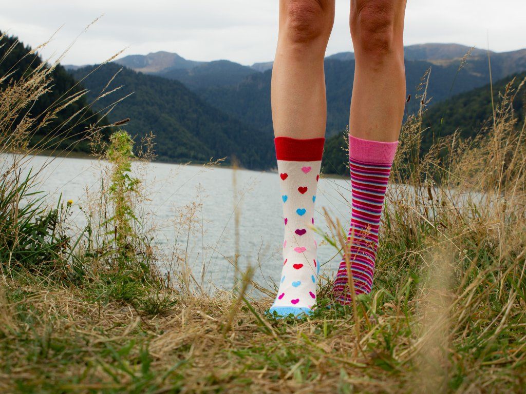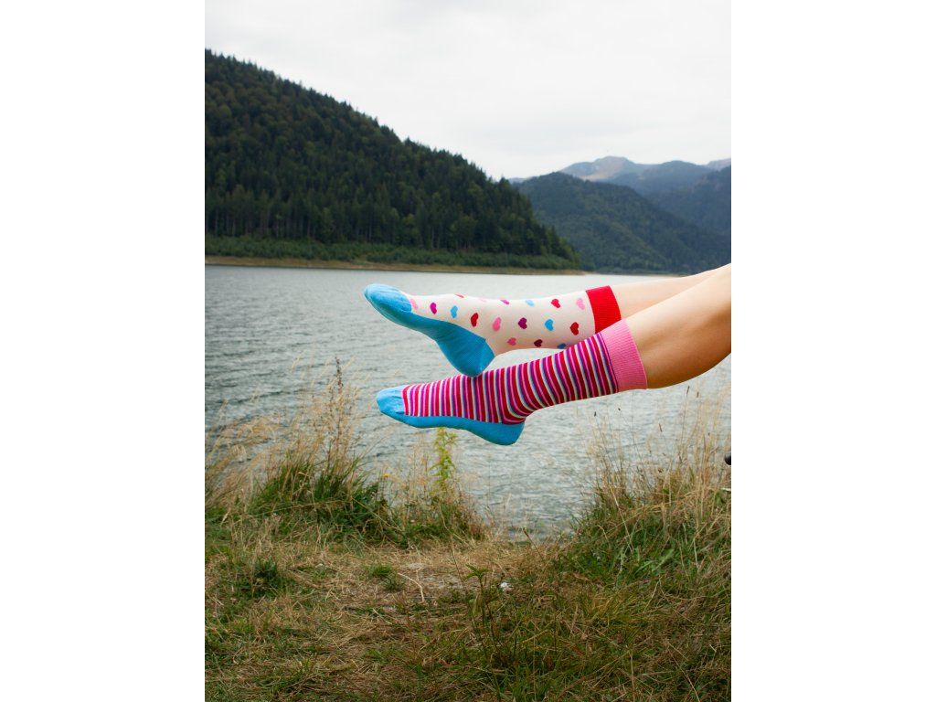 Jeden pár dámských nepárových charitativních bavlněných ponožek v sáčkovém balení. Velikost 36–40, složení 85 % česaná bavlna, 13 % polyamid, 2 % elastan. Motiv: srdíčka — různý vzor na každé ponožce.